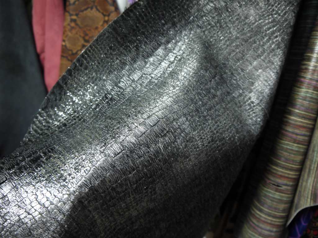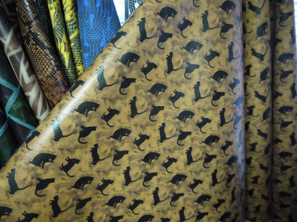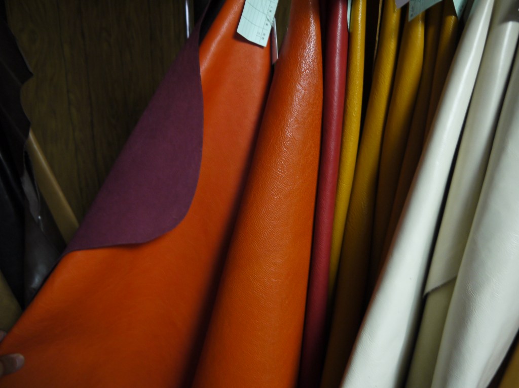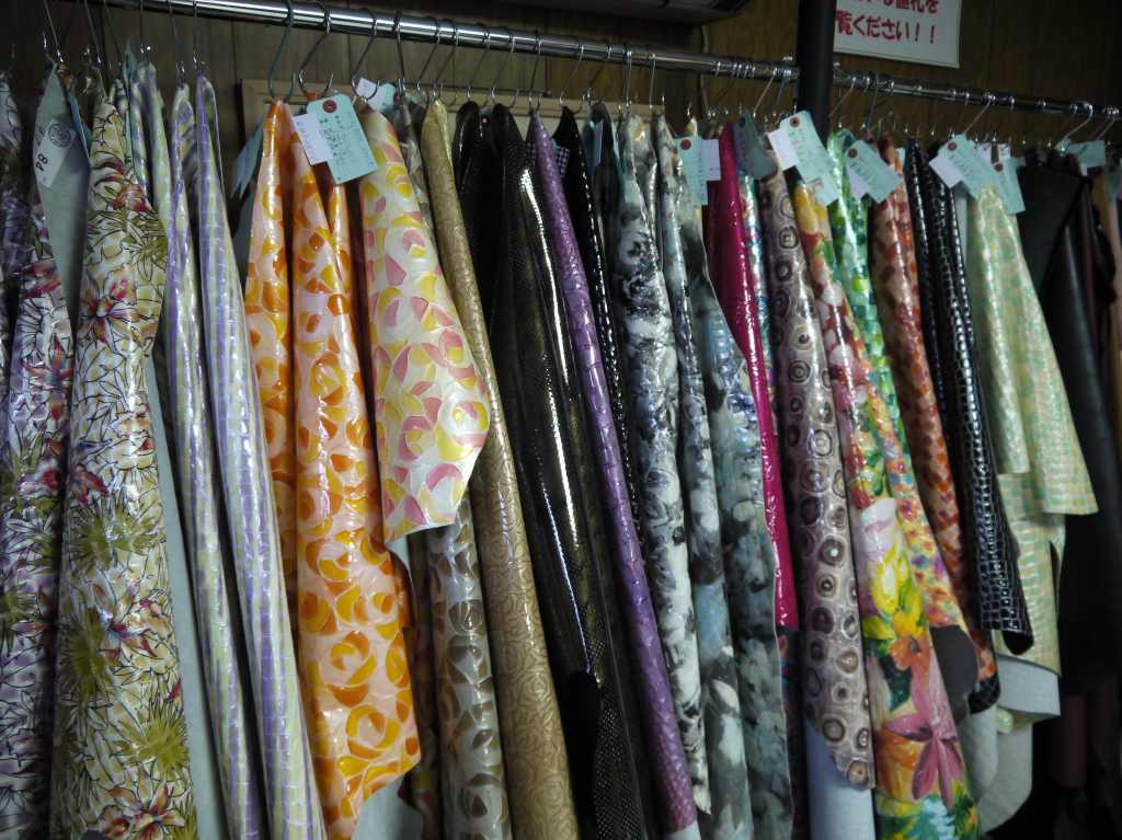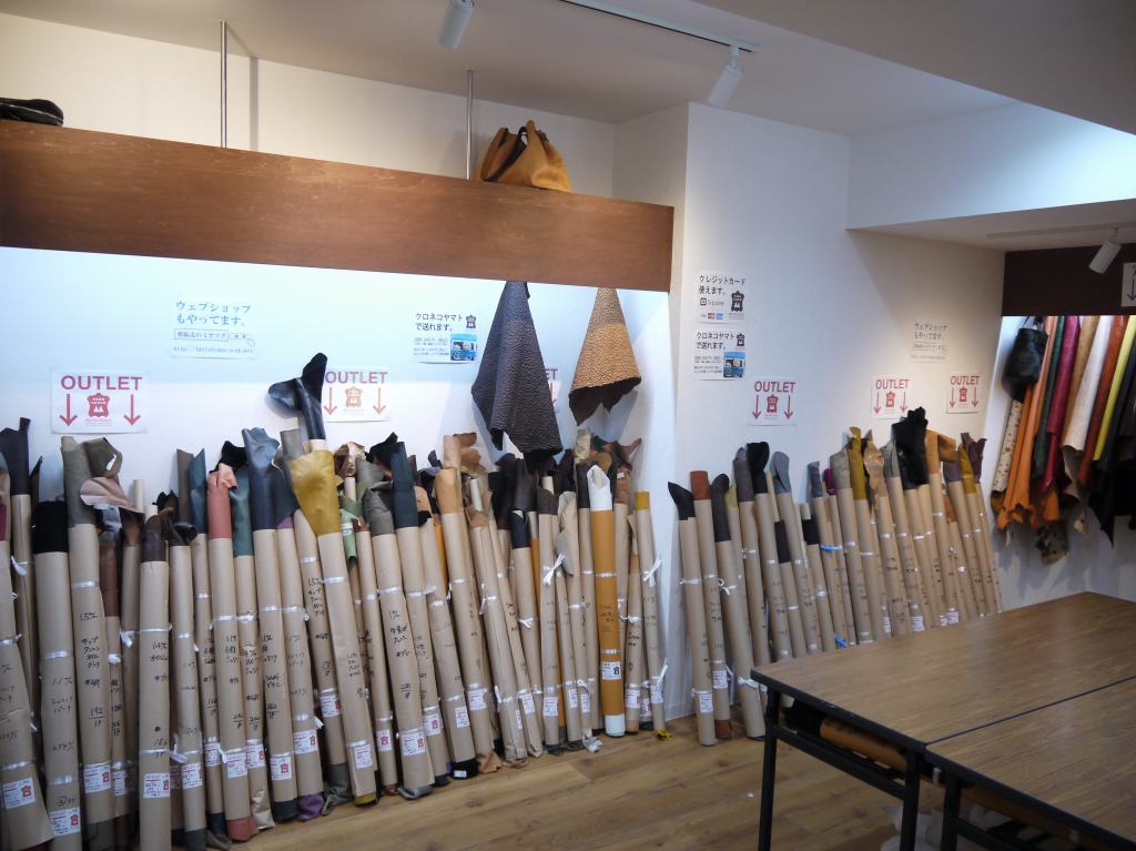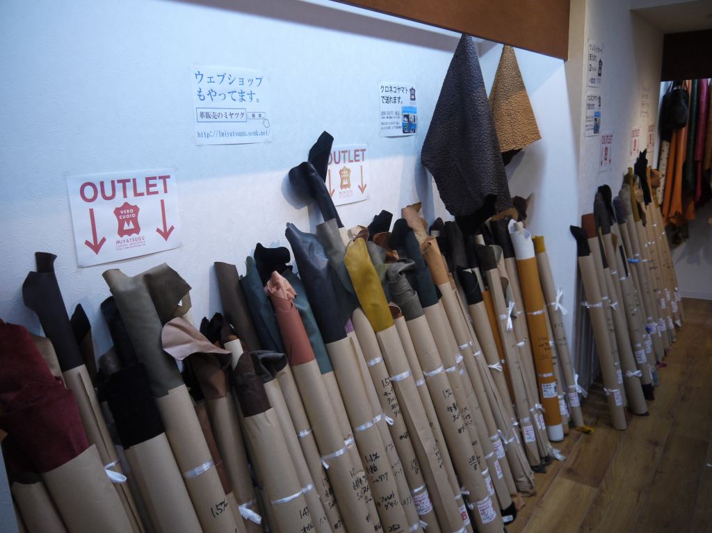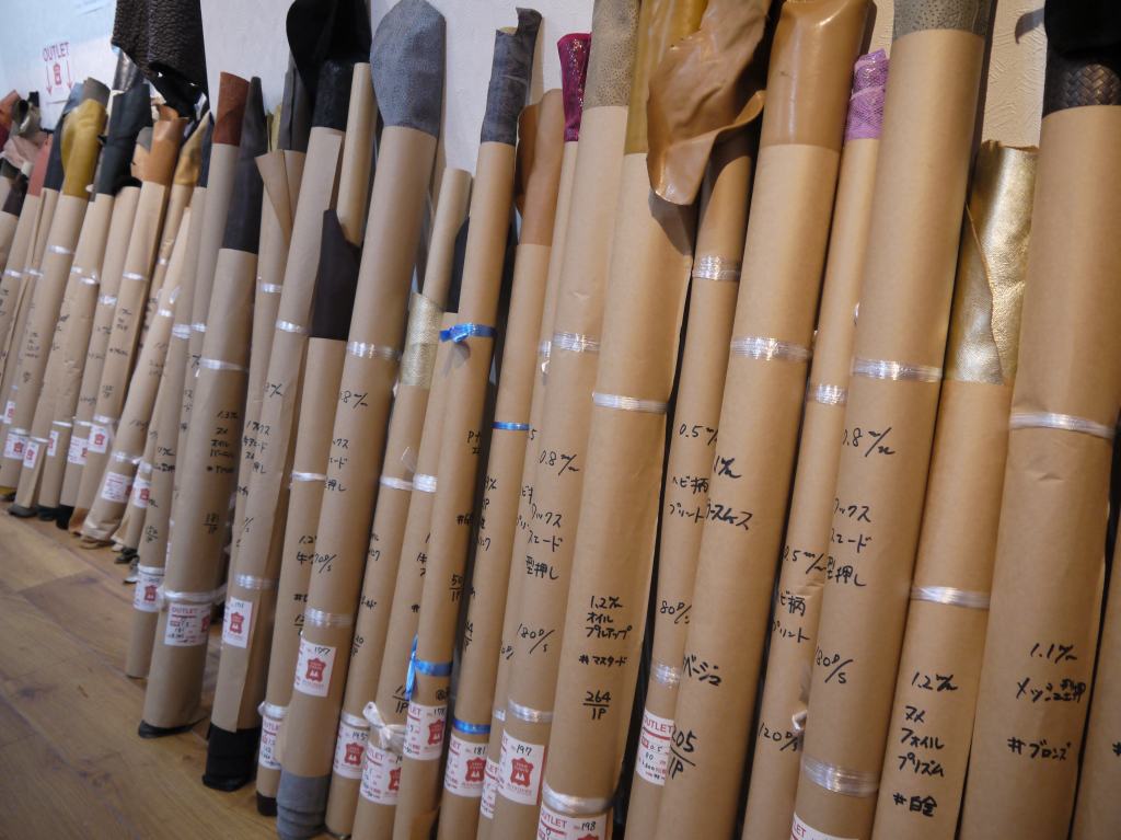 エナメルや海外輸入のクローム革が得意な寿屋さんは相変わらず面白げな1点ものの革が吊るされていたり、巻かれていたり。