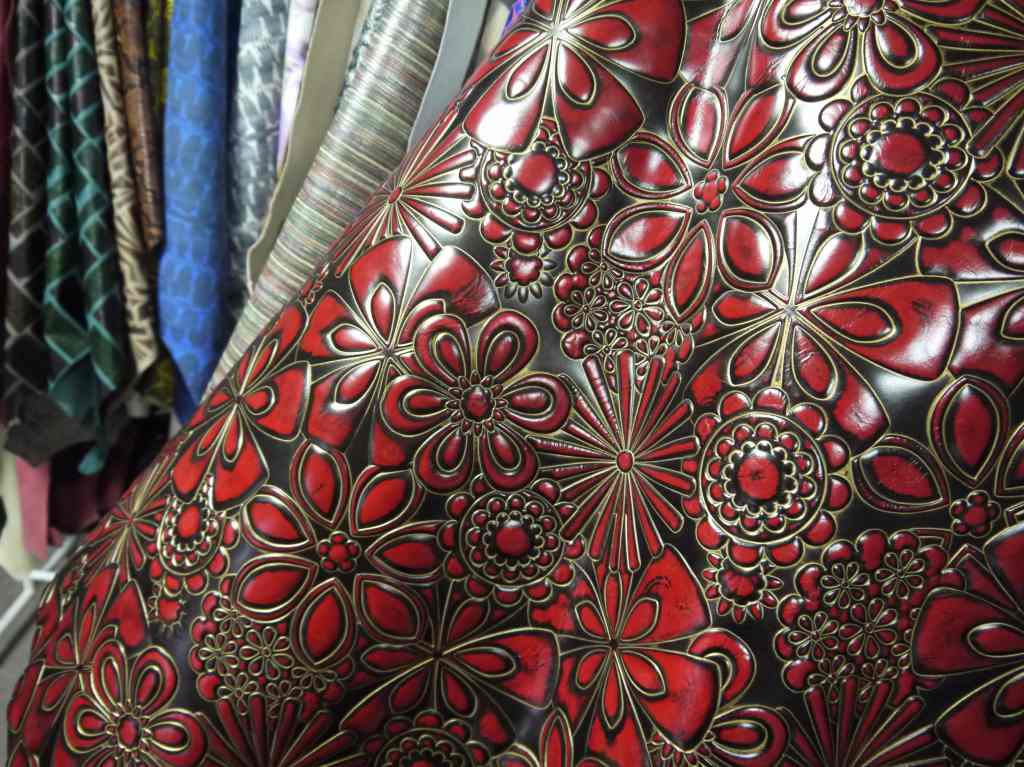 エナメルや海外輸入のクローム革が得意な寿屋さんは相変わらず面白げな1点ものの革が吊るされていたり、巻かれていたり。
